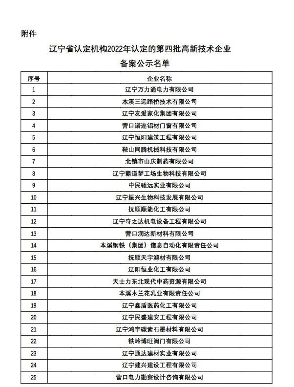 附件:辽宁省认定机构2022年认定的第四批高新技术企业备案公示名单